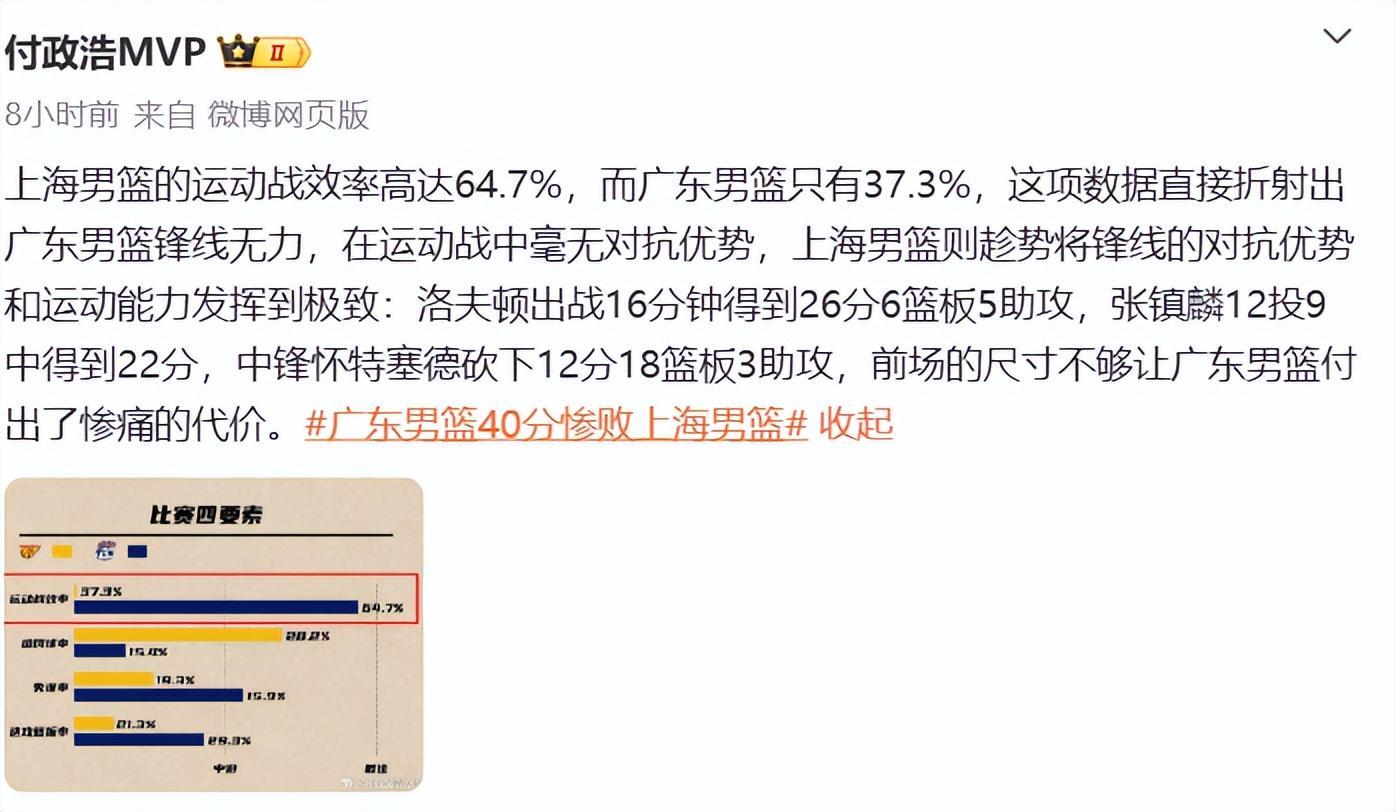 媒体人付政浩赛后晒出了一组数据,并且指出了广东队现阶段存在的1个致命隐患:上海男篮的运动战效率高达64.7%,而广东男篮只有37.3%,这项数据直接折射出广东男篮锋线无力在运动战中毫无对抗优势,上海男篮则趁势将锋线的对抗优势和运动能力发挥到极致:洛夫顿出战16分钟得到26分6篮板5助攻,张镇麟12投9中得到22分,中锋怀特塞德砍下12分18篮板3助攻,前场的尺寸不够让广东男篮付出了惨痛的代价。